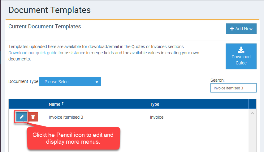 2. Select the template where you'd like a merge fields added to by clicking the Pencil icon.