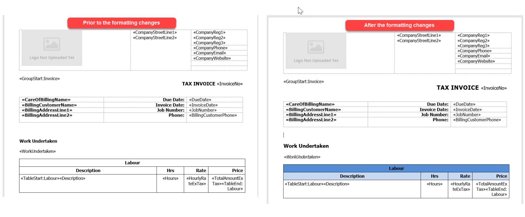 In the following example, we show the invoice template prior to the formatting changes (left photo) and after applying formatting changes namely, table shading, increasing font sizes of some fields (right photo.)
