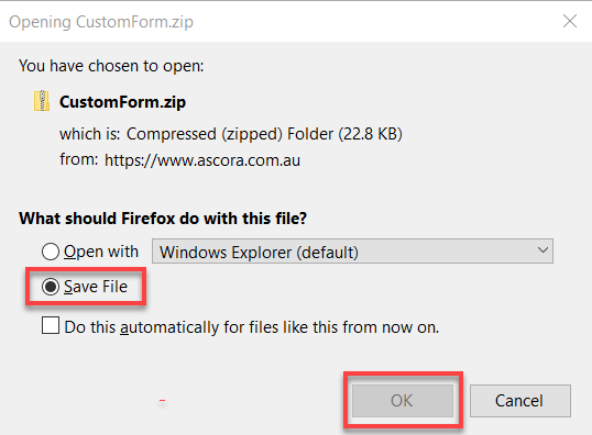 3. Depending on your computer settings, the file will be downloaded otherwise, click on Save File and click OK.