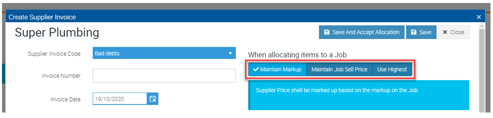 - If the Job Supply does not exist but the Supplier Invoice Item exists on the Supply list, Job Supply Markup will be calculated as: