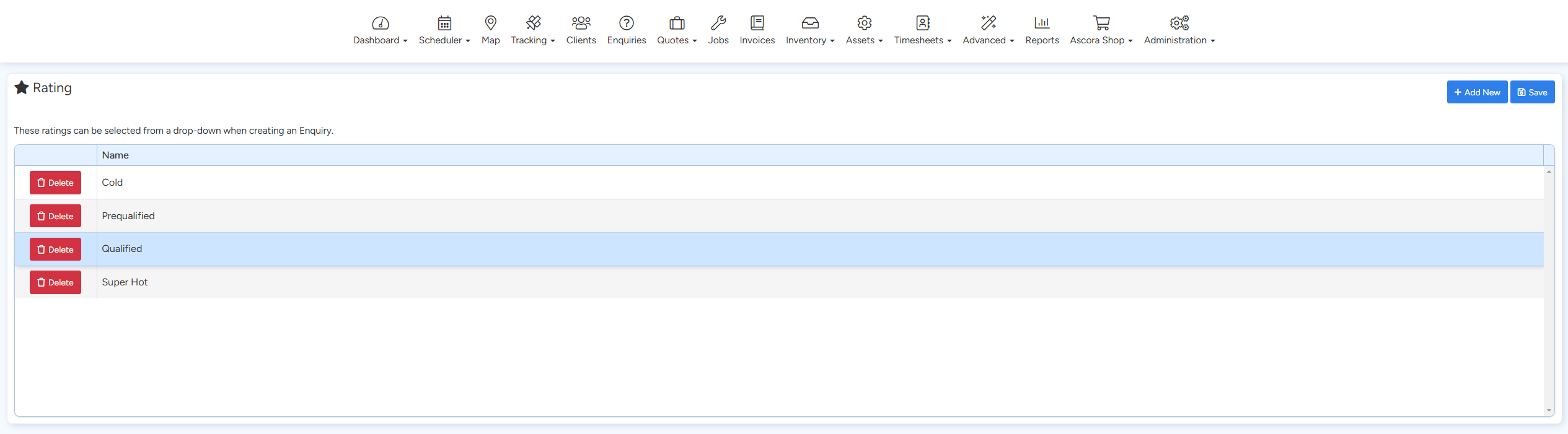 Once you have created lead ratings, they can be applied to Enquiries in Ascora to help track and manage leads effectively.