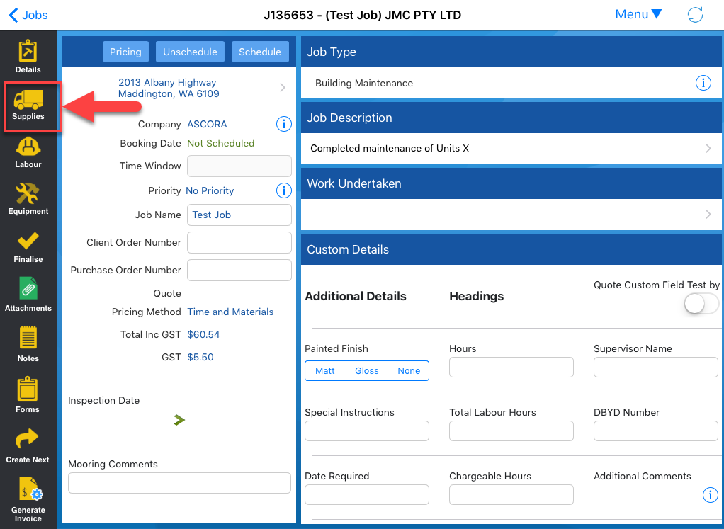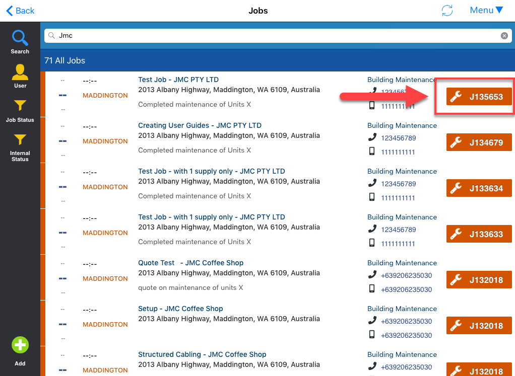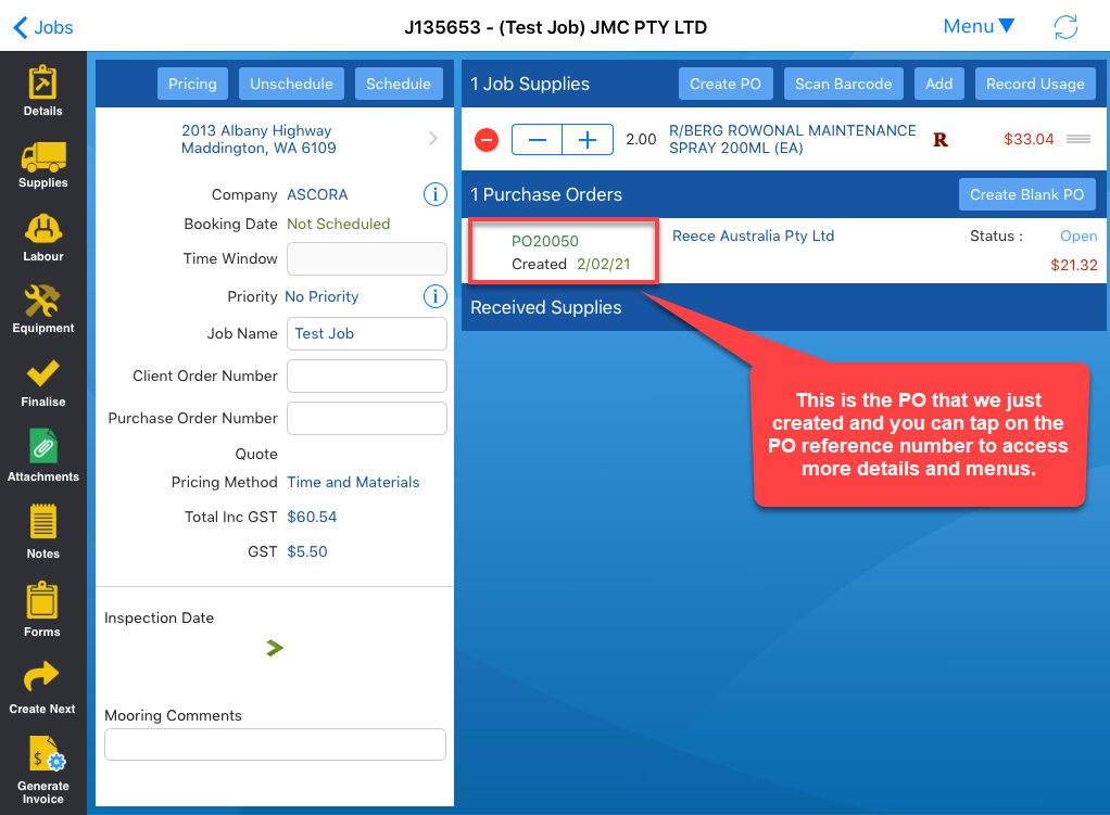 1. Tap on one of your jobs to display more details or menus. This should be the job where you need to create a purchase order.