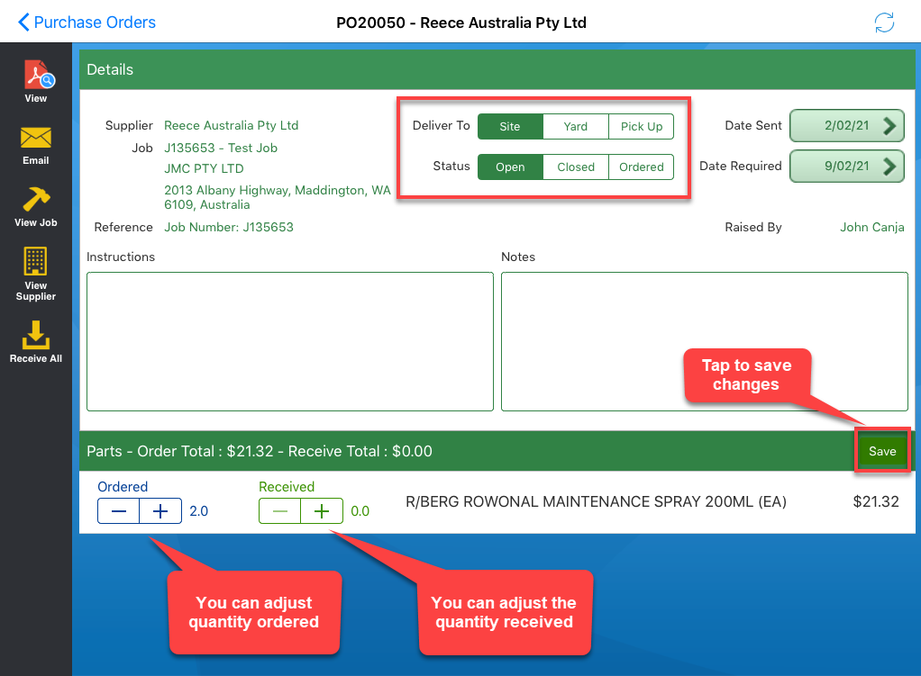 5. From the following screen, you can make adjustments such as changing the delivery option and status, putting instructions and notes, and adjusting quantity ordered and quantity received.