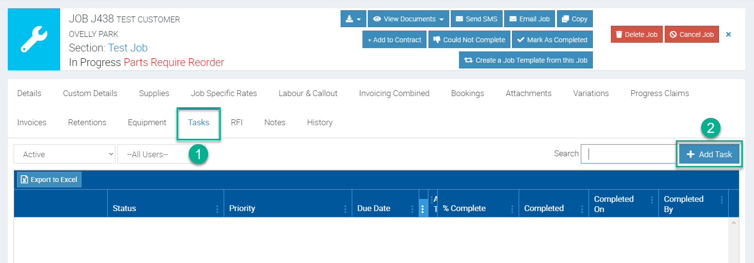 Access the job from the Jobs Menu and click Tasks tab and then click + Add Task.