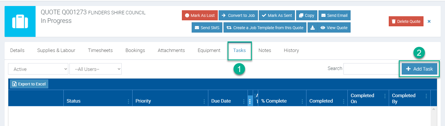 Access the quote from the Quotes Menu and click Tasks tab and then click + Add Task.