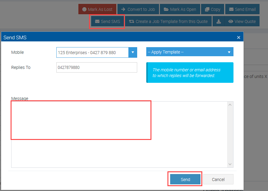 1. From Ascora web, go to job or quote screen and click Send SMS.