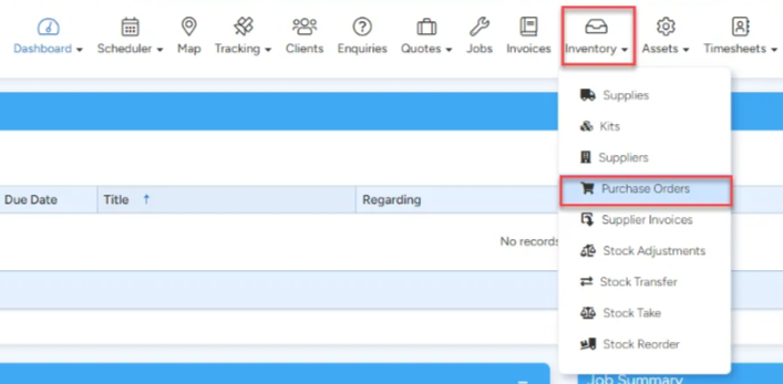 Locate and view the Purchase Order either from the Supplies Tab on the Job Card or by choosing the Purchase Orders option from the Inventory Icon in the Top Menu and searching the Purchase Orders List.