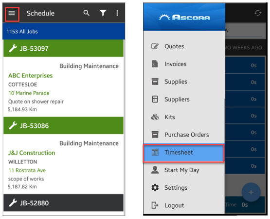 1. Tap the Menu icon indicated by the three lines on the upper left part of the screen and select Timesheet.