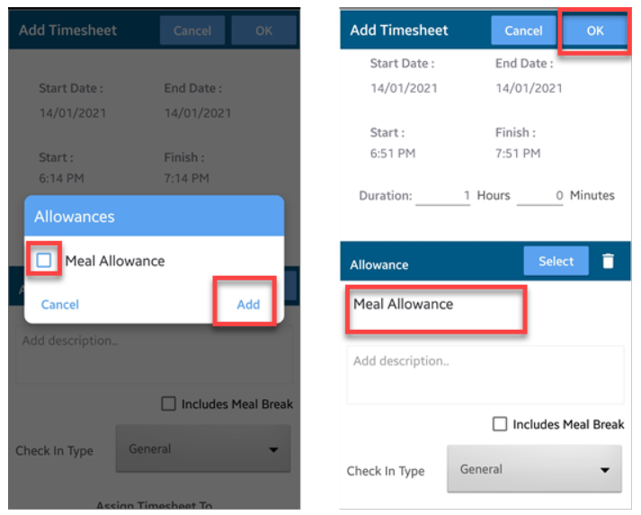 3. Tap the box beside the allowance name and then tap Add. In this example, we are adding Meal Allowance.