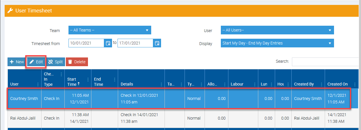 2. Click the Timesheet line item that you need to edit and click Edit.
