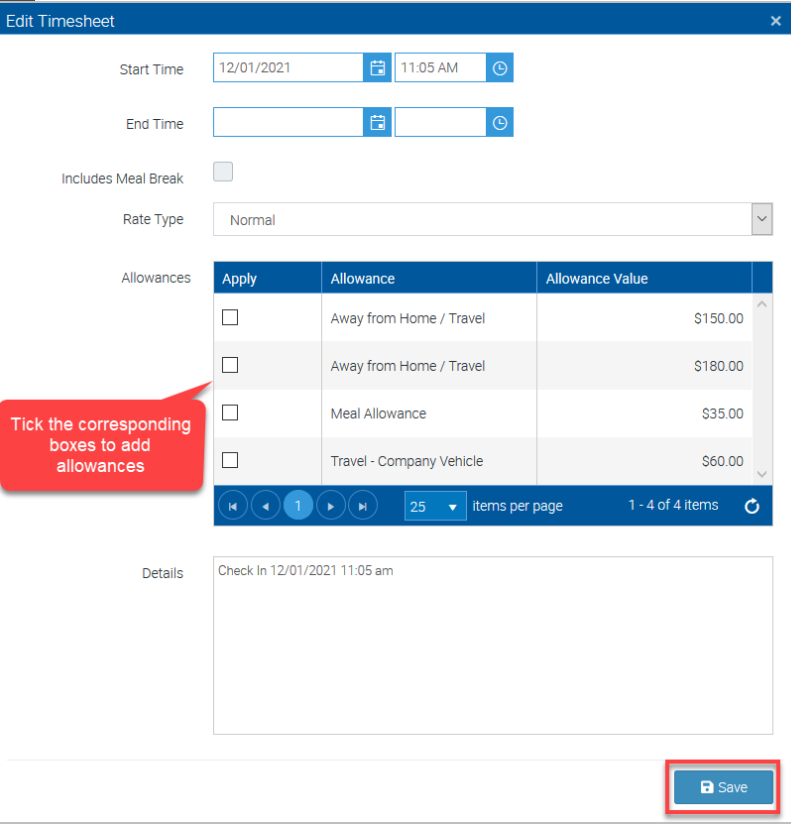 In this example, we are adding Meal Allowance but we can add other allowances if applicable by ticking the corresponding boxes.