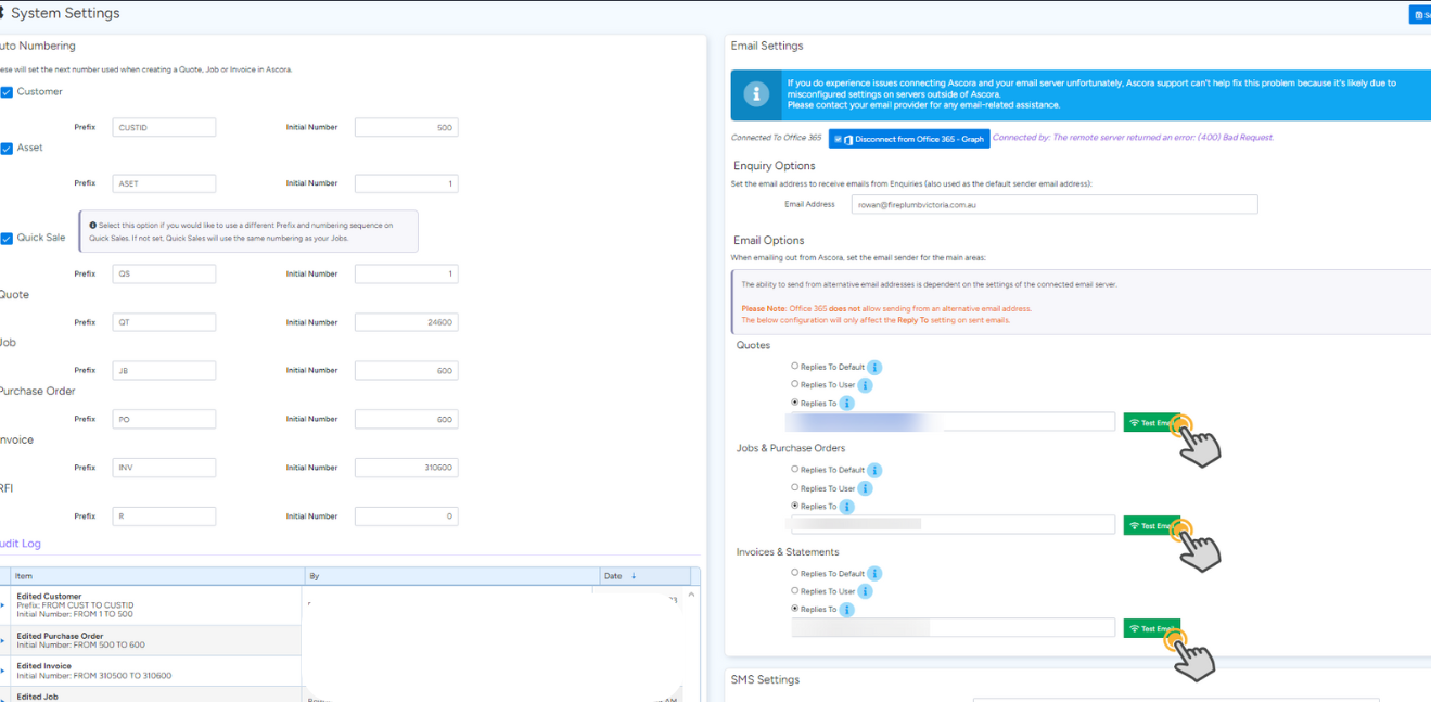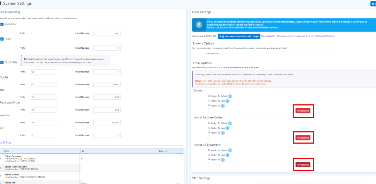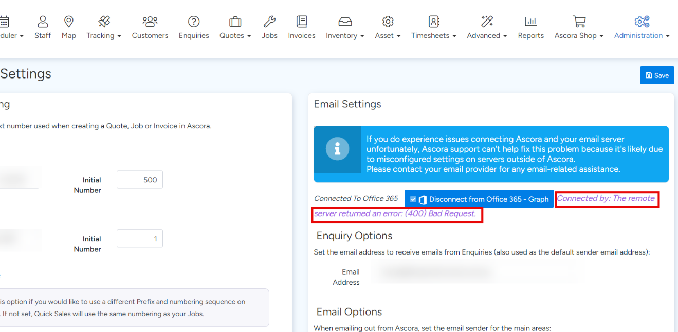 If you continue to experience issues connecting Ascora to your email server, please note that Ascora support cannot resolve this issue, as it is likely due to misconfigured settings on external servers. For any email-related assistance, please contact your email provider.