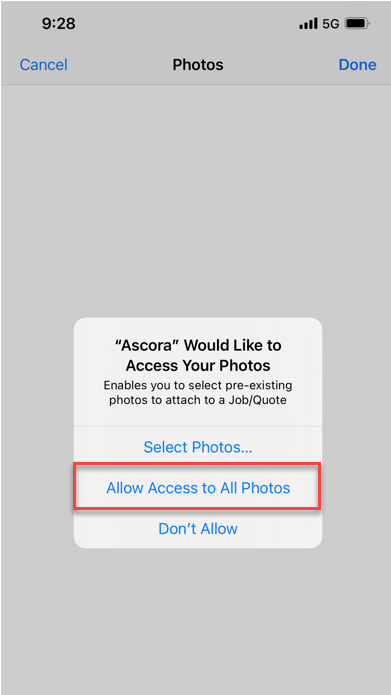 When selecting to add an attachment the below message will appear. By selecting Allow Access to All Photos this will ensure access to all photos for future jobs.