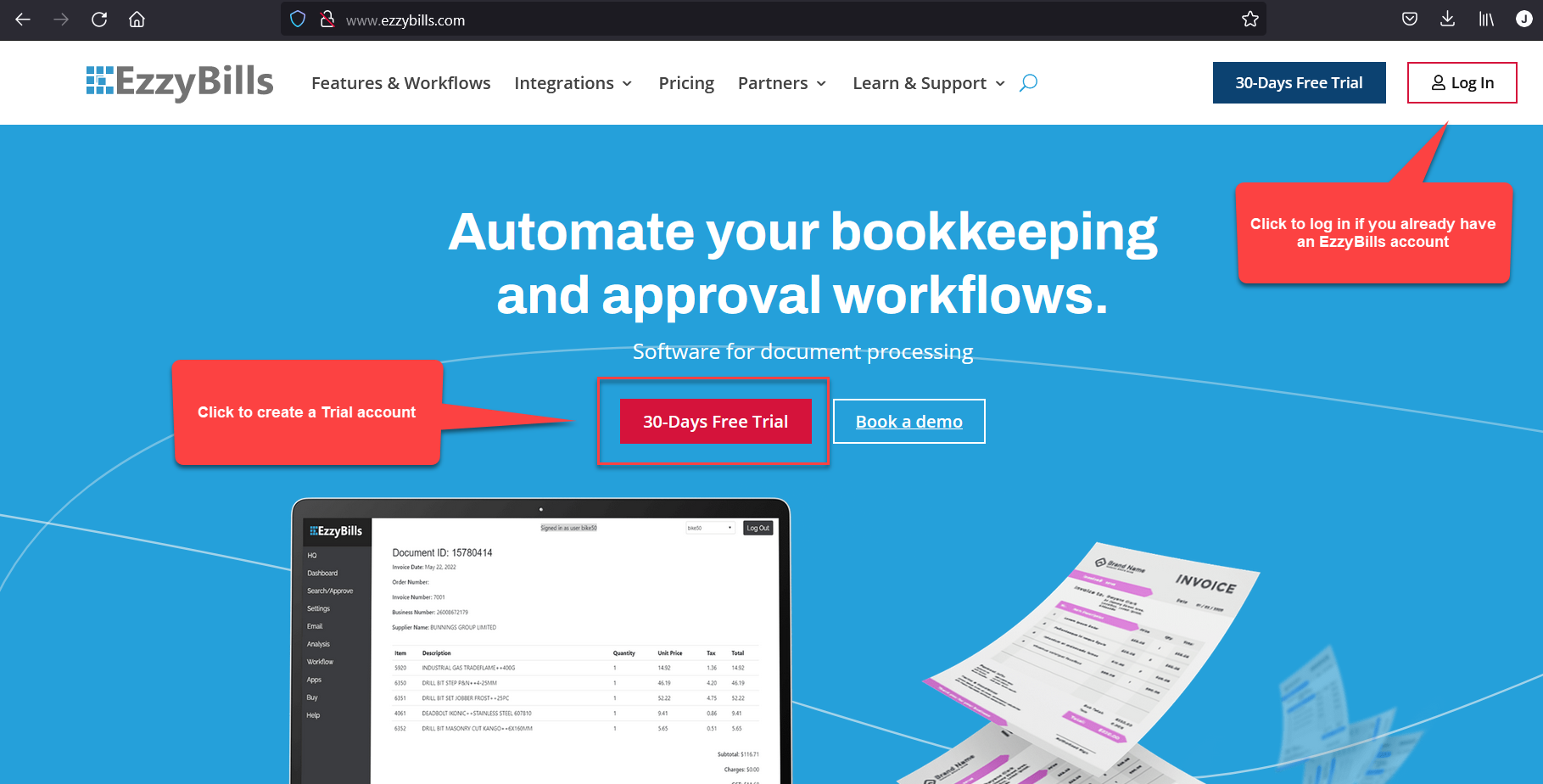 1. Go to http://www.ezzybills.com/ and log into your EzzyBills account. If you don't have an account with EzzyBills, you can click on the 30 Days Free Trial button to register.