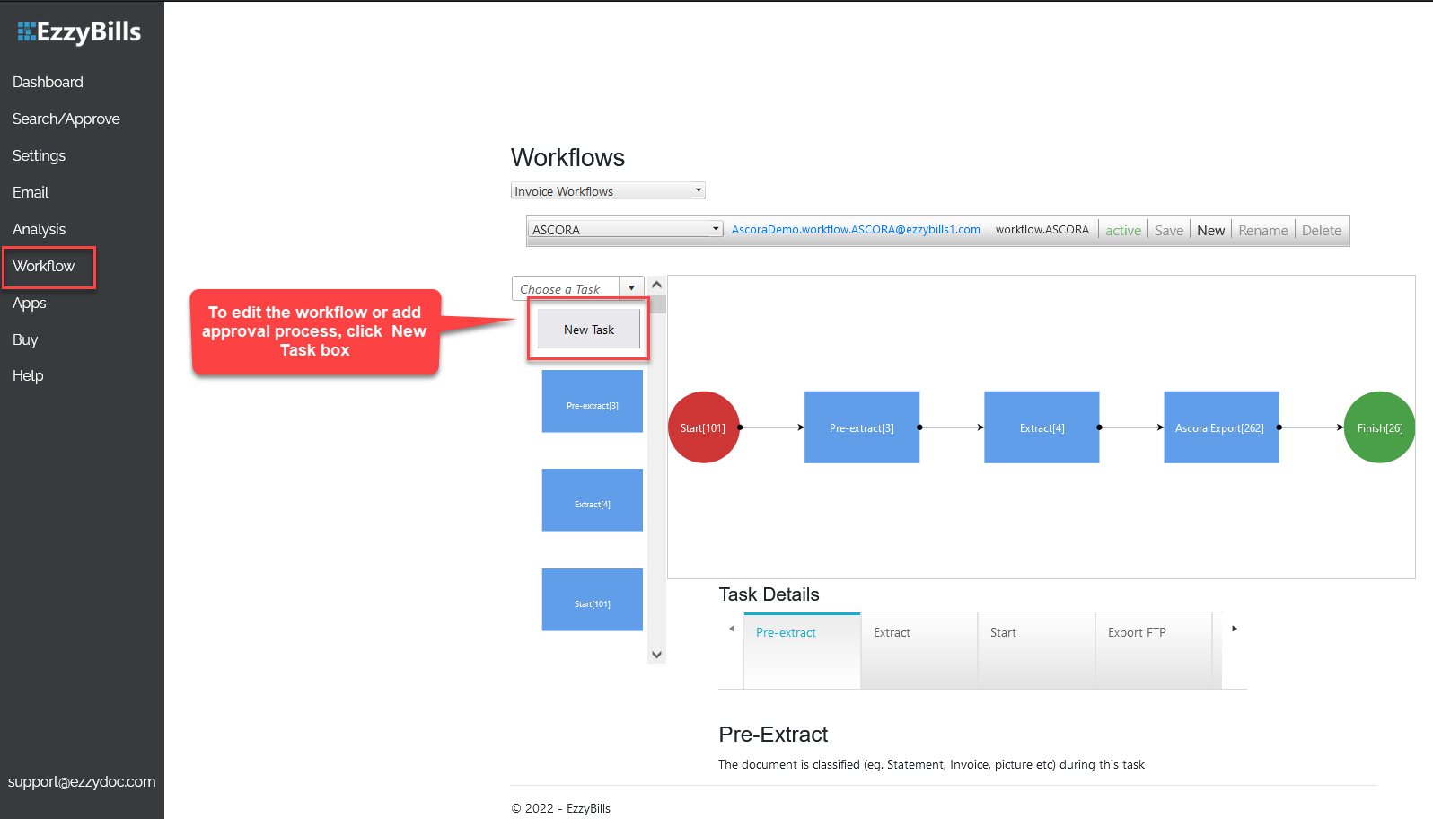 This is the standard workflow for EzzyBills and Ascora integration but if you want to update this workflow such as adding an approval process, you're able to do it by clicking New Task.