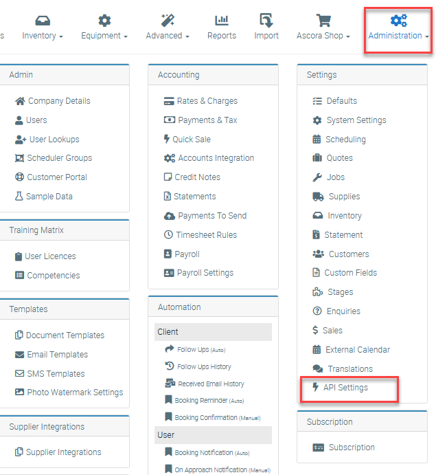 5. Accessย  https://ascora.com.au/ and log into your Ascora account then go to Administration โ†’ API Settings.