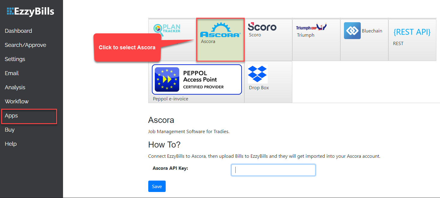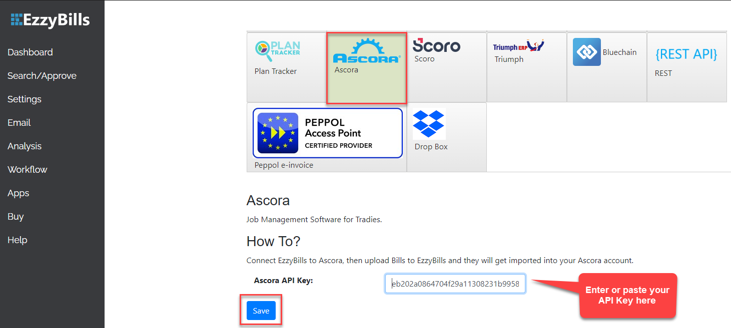 Your API key is the direct connection between your Ascora account and EzzyBills in order to sync both systems as part of the integration process. The next step is to obtain and copy your unique API Key in Ascora and paste it into the EzzyBills by going to theย  Apps tab.