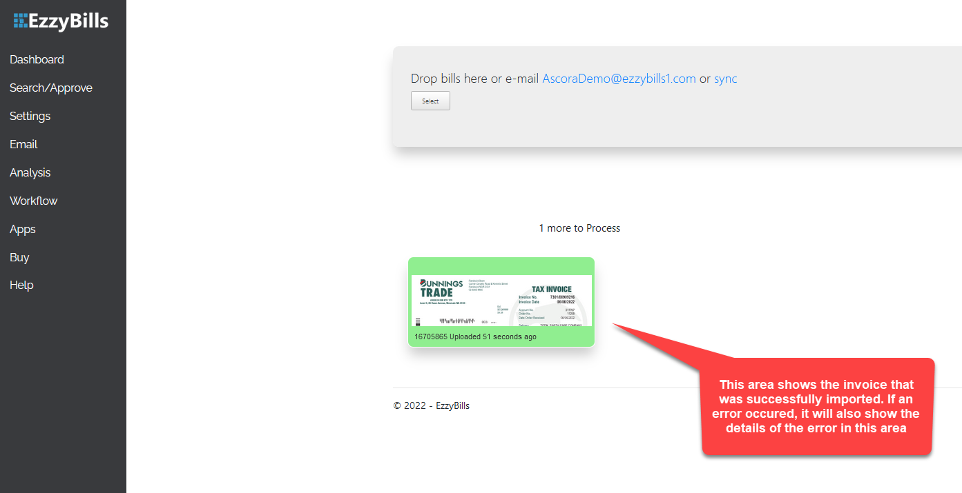 2. EzzyBills processes the invoice and shows a preview in the Dashboard similar to what is shown in the image below. This is the same screen where the error displays if something went wrong during the upload or import process.