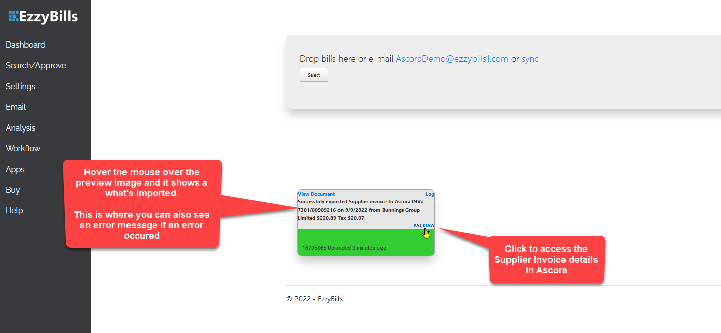 EzzyBills support an approval workflow and will only send the invoice details to Ascora once approval process is complete. This can be set up in the Workflow tab.