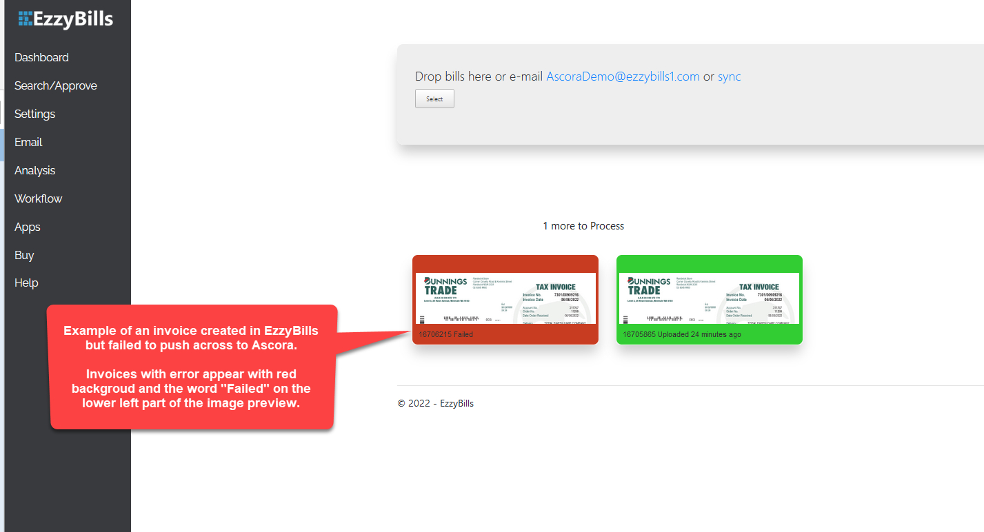 Invoices added to EzzyBills but encountered an error show as images with red background compared to successfully processed ones that appear in green background.