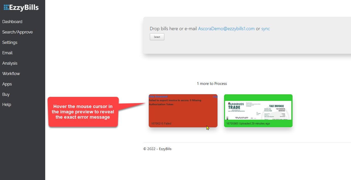 Hover the mouse cursor in the image preview to see the details of the error. In this example, this invoice failed to push across to Ascora due to missing authorisation token which can be set up in the Apps tab.