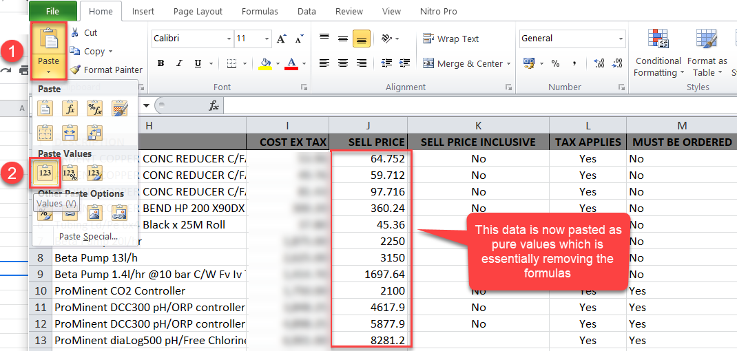 In this example, we are removing the formulas in column J by pasting the data as values.