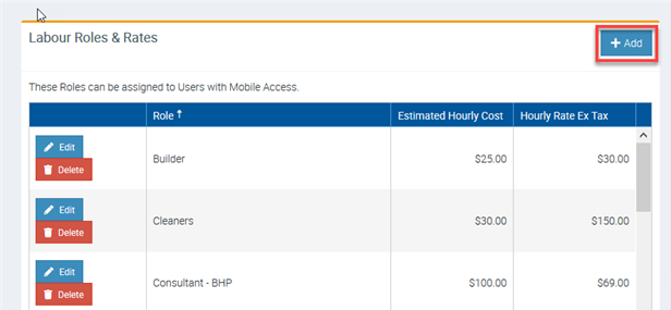 1. To set up Labour Roles and Charges, go to Administration -> Rates & Charges -> Labour Roles & Rates -> click Add.