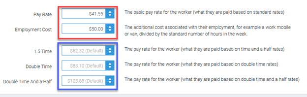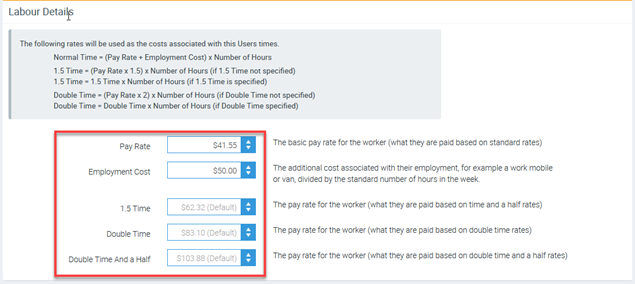 2. In Labour Details enter the pay rate, employment cost and the rate for the 1.5 Time, Double Time and Double Time and a Half rates.