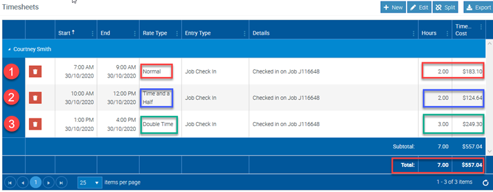 In the following Timesheet example, user has three check in entries and has different costs associated with each entry: