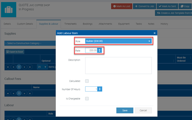 When working with Quotes and Jobs, the labour details and calculations are based on what you set in the Labour Roles and Rates section.