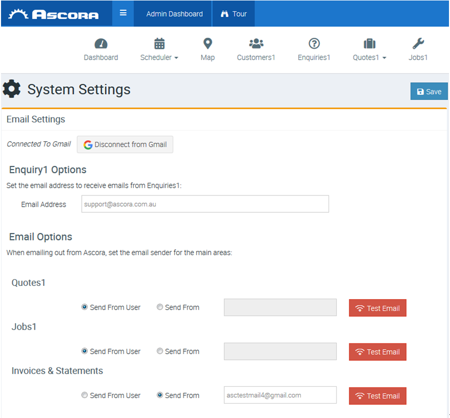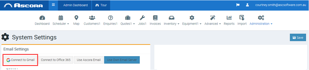 4. After allowing Ascora to access your google account, the page will return to the Ascora System Settings Now the email settings will show that you are connected to Gmail.