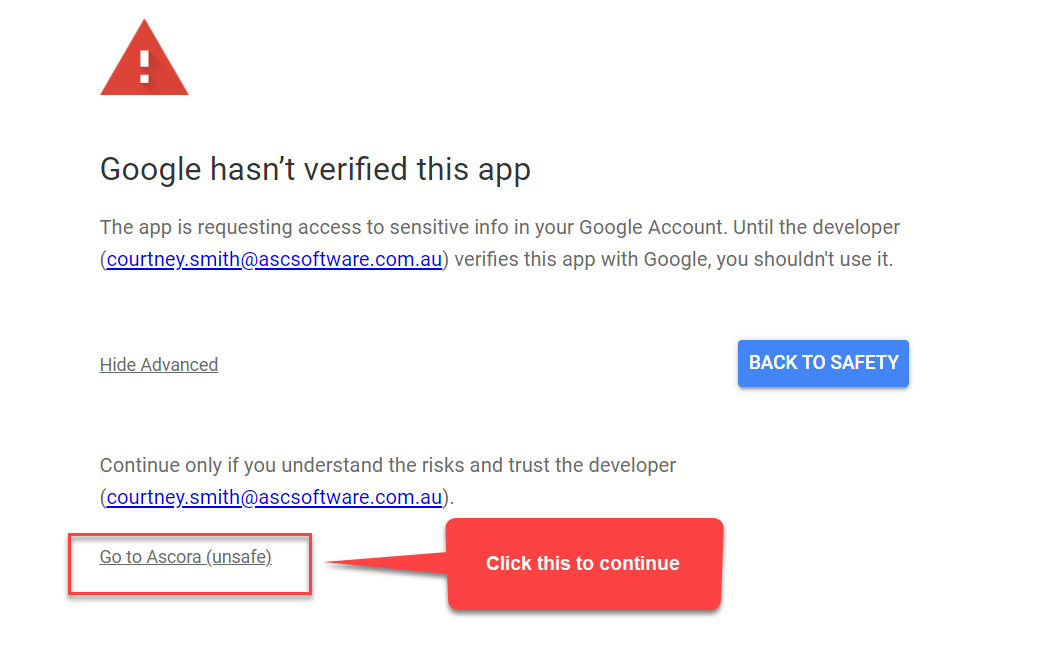 2.2 Click Go to Ascora (unsafe) to proceed. Please note that this prompt appears as a security measure in Google.