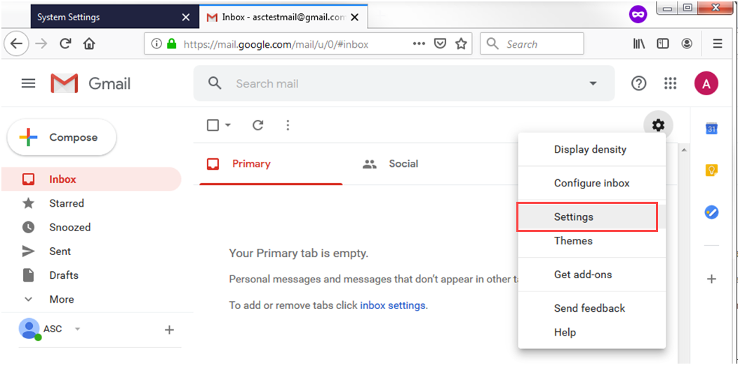 1. Go to the Gmail account you used to set up your current email on Ascora and find Settings which is located within the right-hand side icon menu.