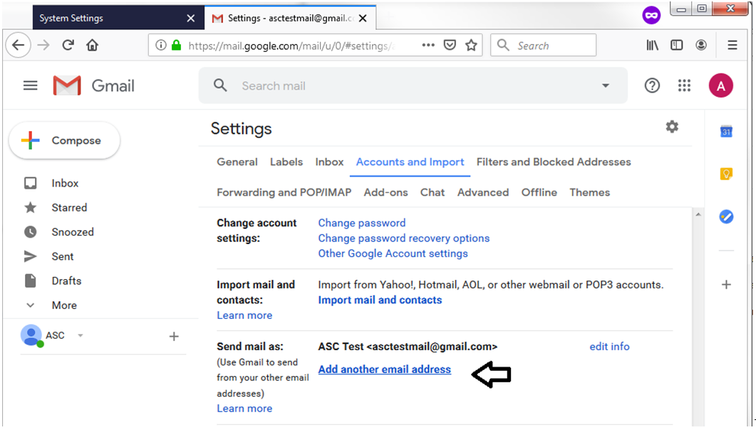 2. Once you are in Settings, go to the tab Accounts and Imports. Next, go to the option Send mail as and click on the Add another email address
