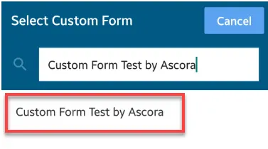 3. Select the custom form that you need to test and in this example, it's called Custom Form test by Ascora.