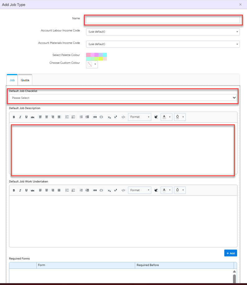 3. Enter the Job Type name, select the default checklist, and add a default description.