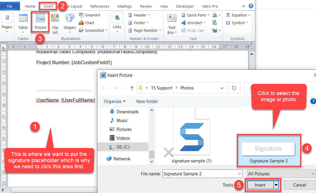 5. Once you've opened the template, place the cursor in the field where you want to add the signature and click Insert → Picture → select a picture → Insert.