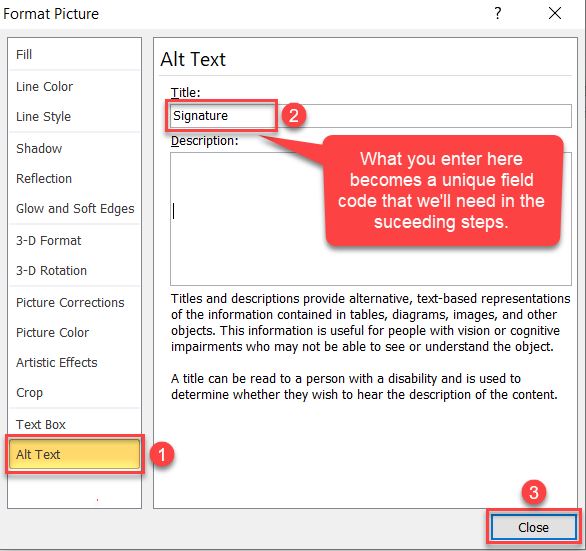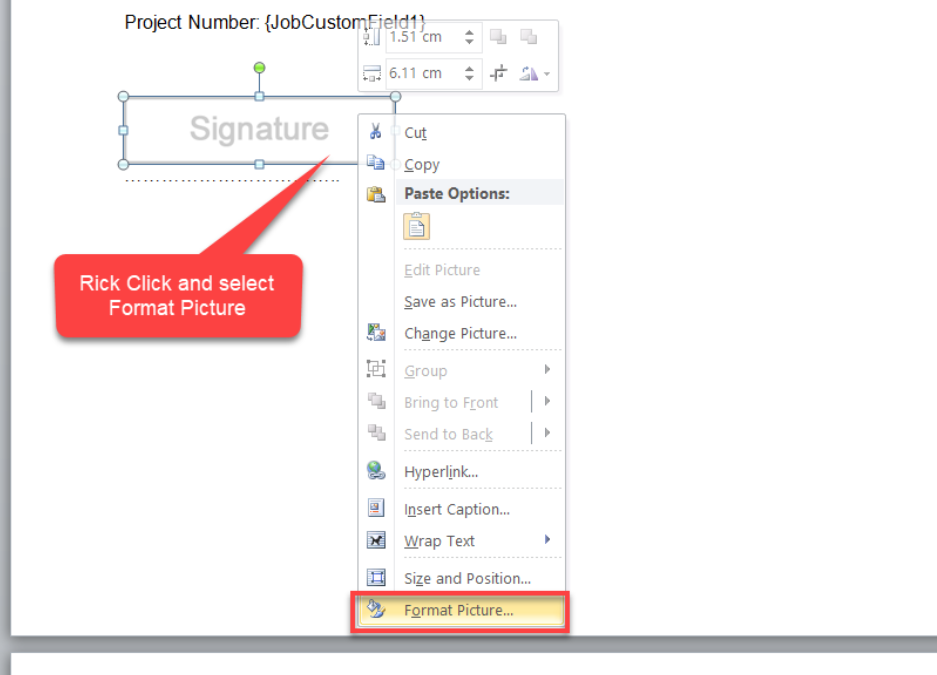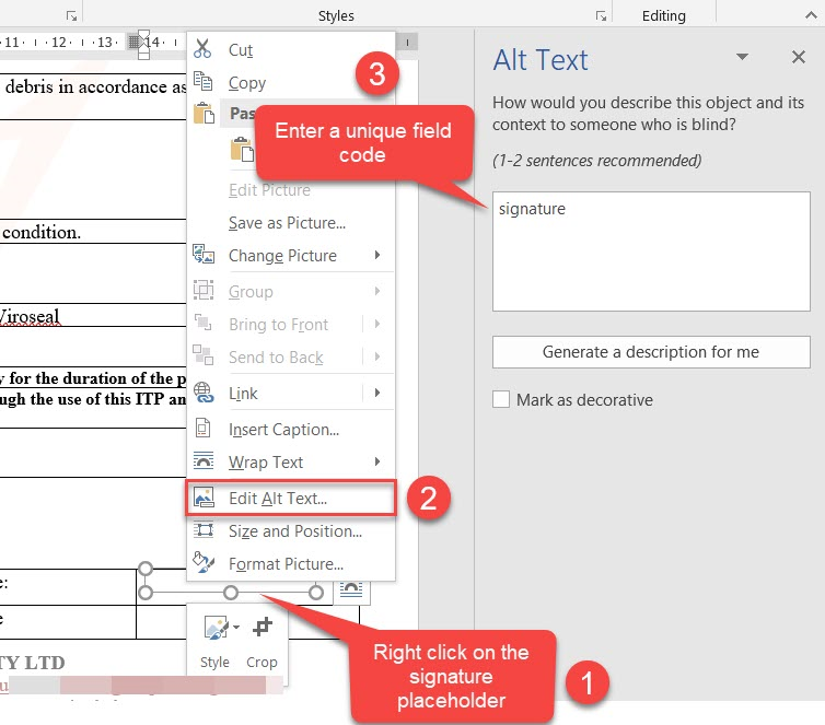 6.1 If you have a newer version of Microsoft Word, right-click on the signature placeholder and select Edit Alt Text and you'll see the option to enter a field code.