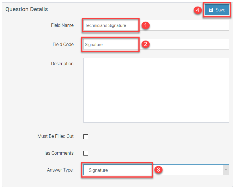 10. Enter the Field Name, Field Code, and select Signature as your Answer Type and click Save.