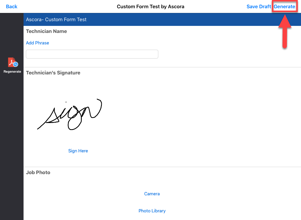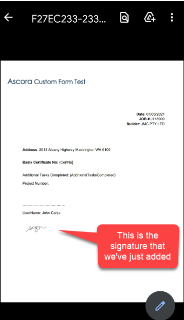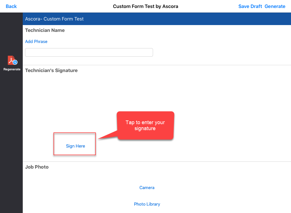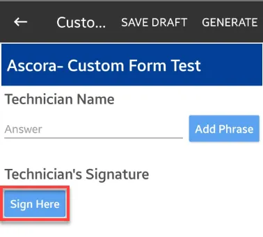 4. Once the custom form is displayed, you would be able to add your signature by tapping Sign Here.