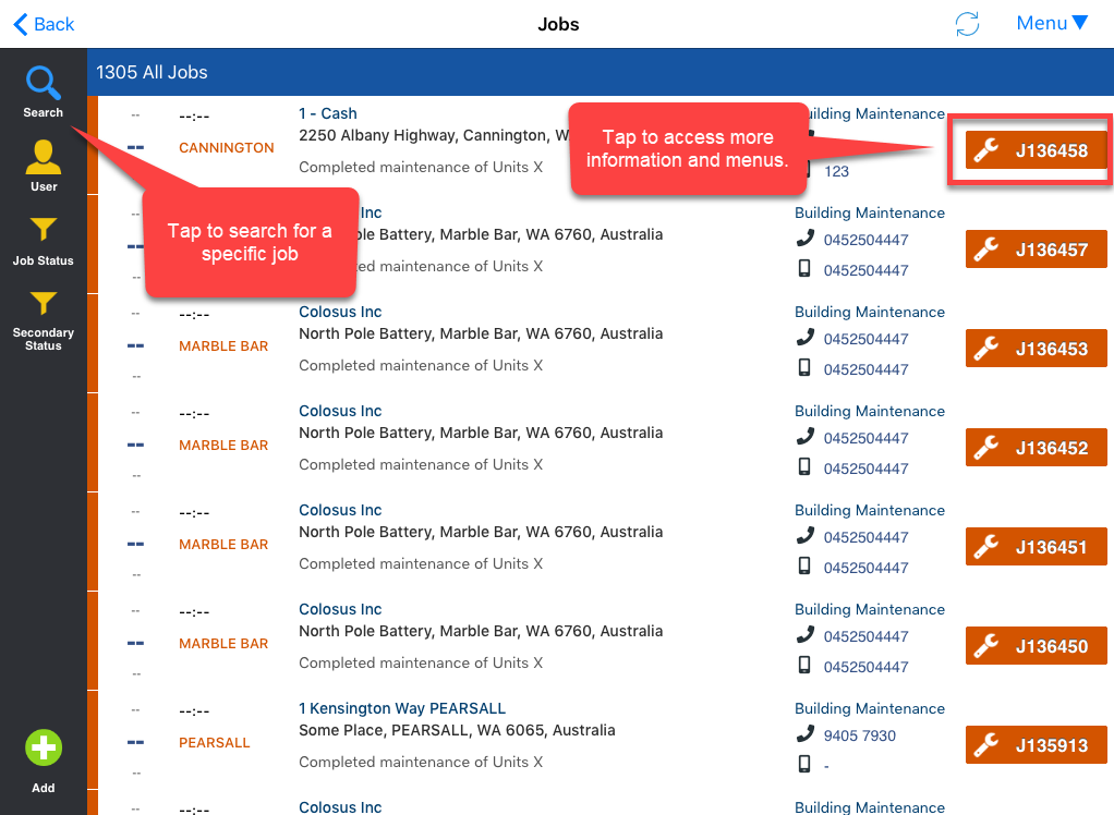2. Tap one of the jobs to access more details and menus. Alternatively, you can use the search button to search for a specific job.
