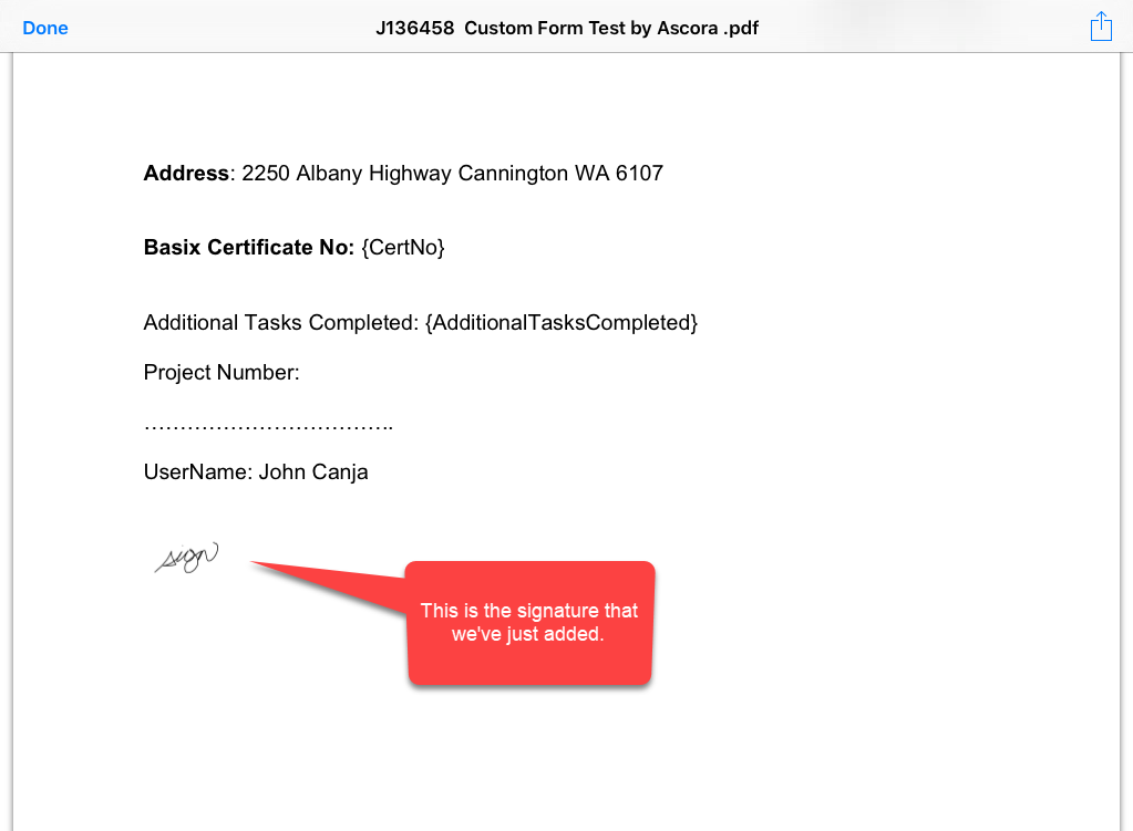 In this example, our field code is Signature and it must be exactly the same format when we enter this in Ascora Form Question later.