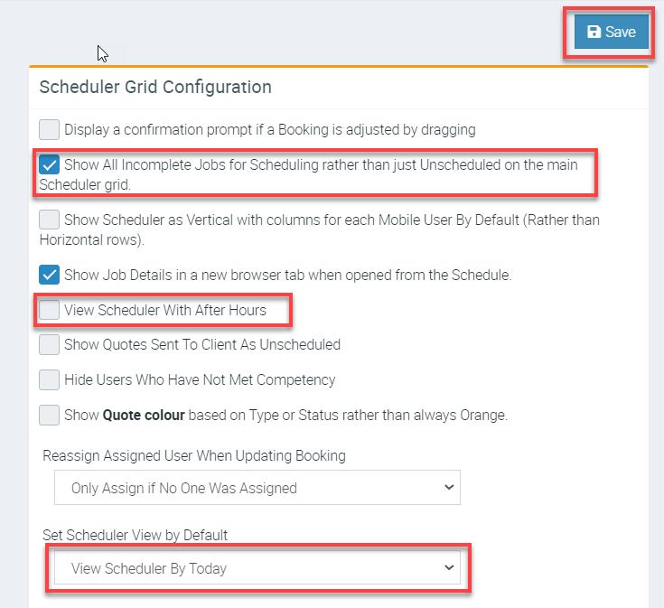 3. After enabling/disabling your preferred settings, click Save and you can go to Scheduler and immediately see the changes.