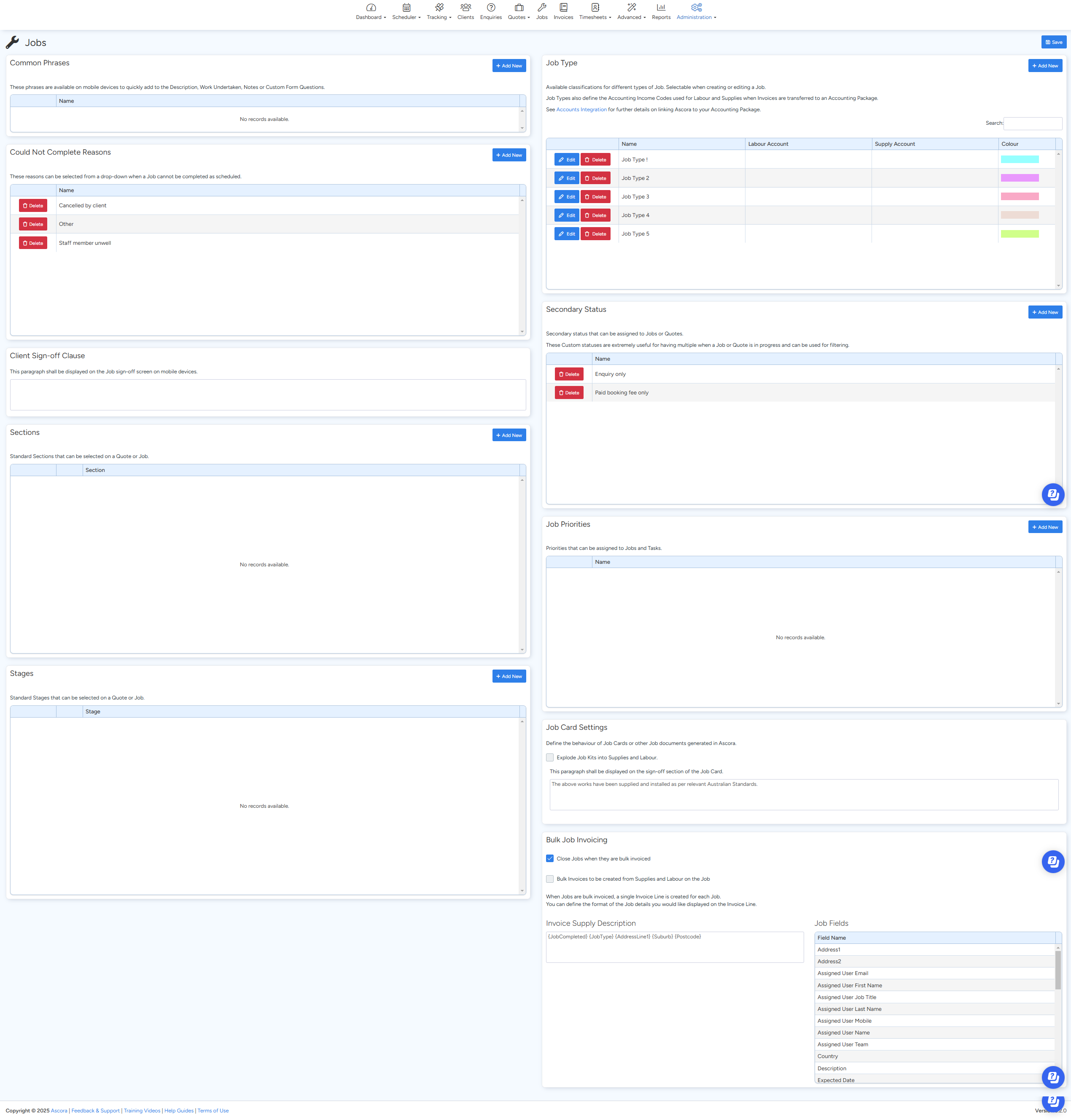 The Jobs Administration section in Ascora allows you to configure various settings that streamline job management. These settings include defining job types, setting up standard phrases for mobile use, configuring job statuses, and managing client sign-off clauses. By customizing these options, businesses can improve workflow efficiency and maintain consistency across job records.