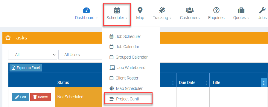 There are a couple of ways to access the Gantt Chart, one is from the Scheduler → Project Gantt.