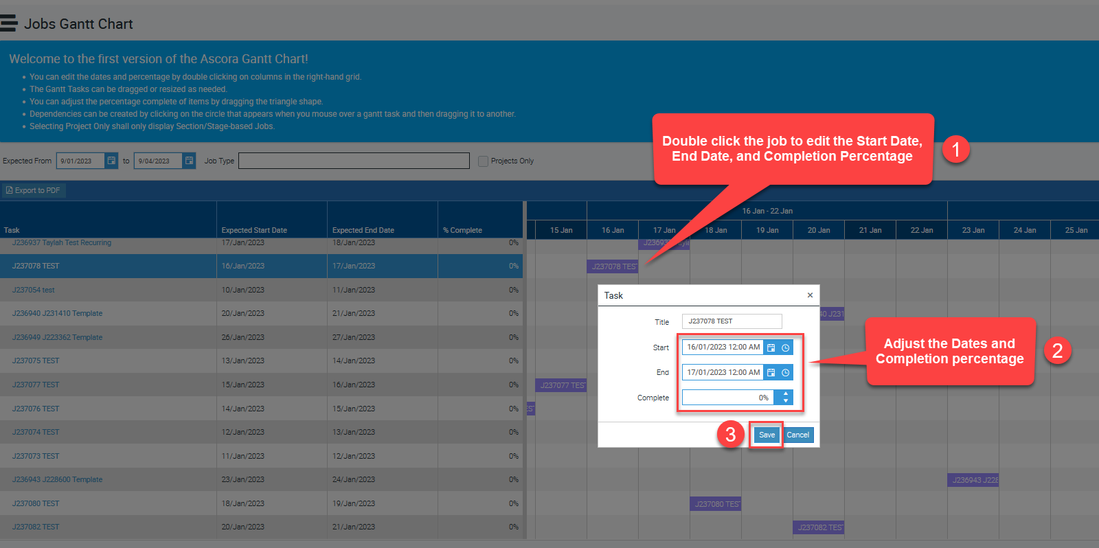 Double-click the job box and you'll see a pop-up box where you can edit the dates and completion percentage.