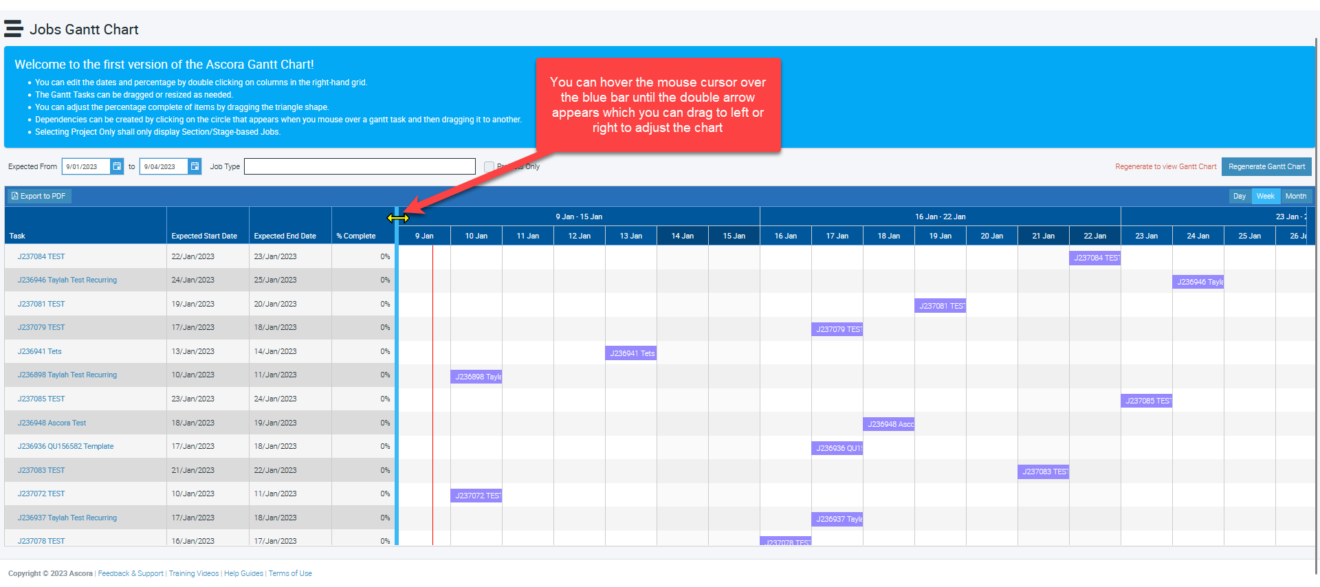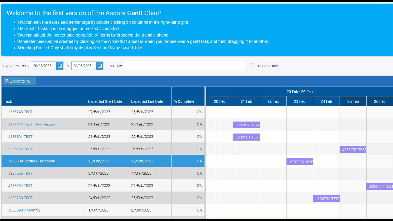 Here's an overview of the functionalities available in the Gantt Chart such as filter options, changing the view from weekly to monthly, adjusting task dates, and many more.