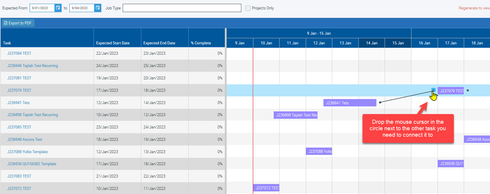 You can create dependencies between two tasks or projects in the Gantt Chart and once configured, these tasks will have lines connecting them to show these dependencies.
