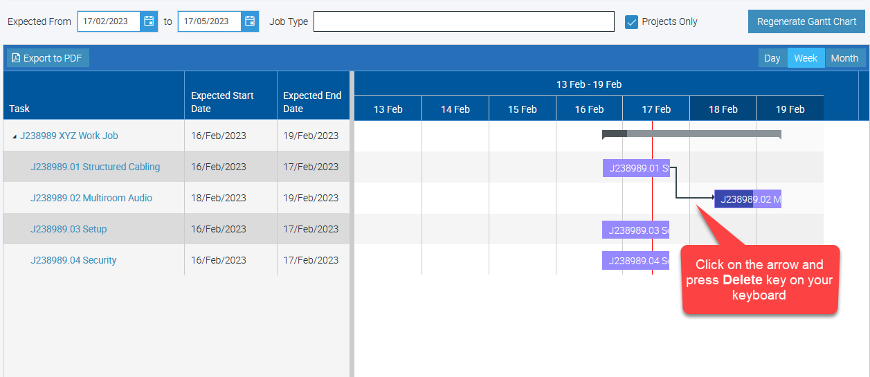 To remove dependencies between tasks or projects, click on the arrow and press the Delete key on your keyboard.