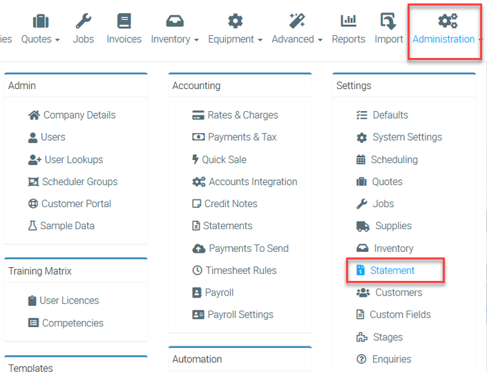 1. When using the Statement feature in Ascora, you are able to set a couple of settings by going to Administration → Statement.